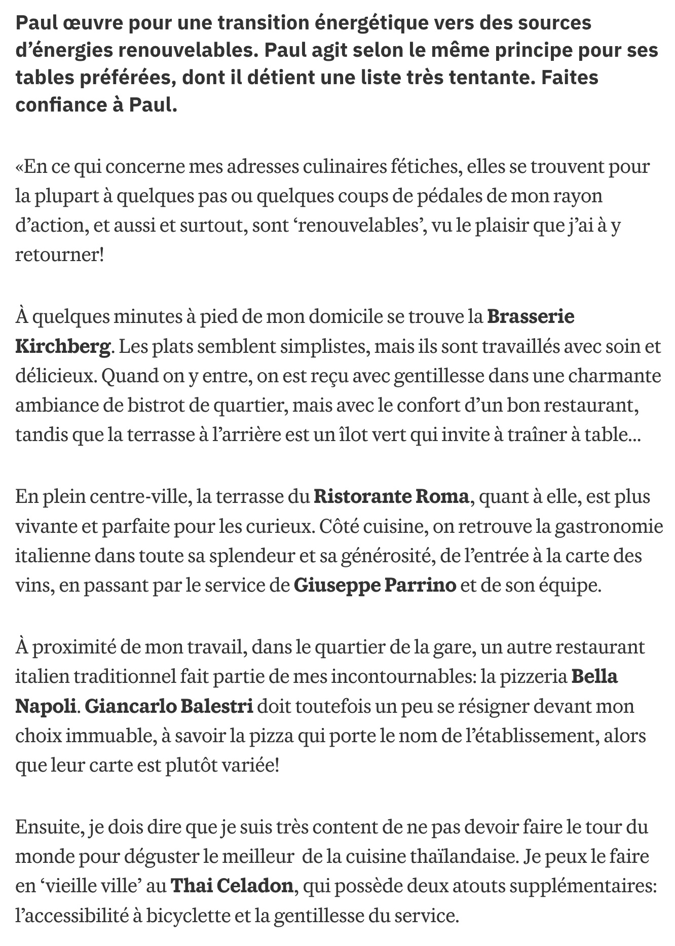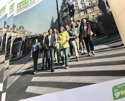 Elo mierkt awer jiddereen hei an der Stad, dass wann déi gréng net méi mat décidéieren, dass et dann net méi wäit hir ass mat grénge Basics bei de Leit vun der Majoritéit. Aner Hiewele gi bedengt: e puer Strécher mat waasserléislecher Faarw fir éphémère, popup Velospisten. Oder Alibi Biergerbedeelegungsaktioun Taxonomiestuf 1, um Beispill vun den Aménagementer vun der avenue Pasteur. An och do ass zousätzlech traureg: deen eenzege Choix deen d’Majoritéit bidd, ass Beem oder Velo. Awer nëmmen dem Auto näischt ewäch huelen.