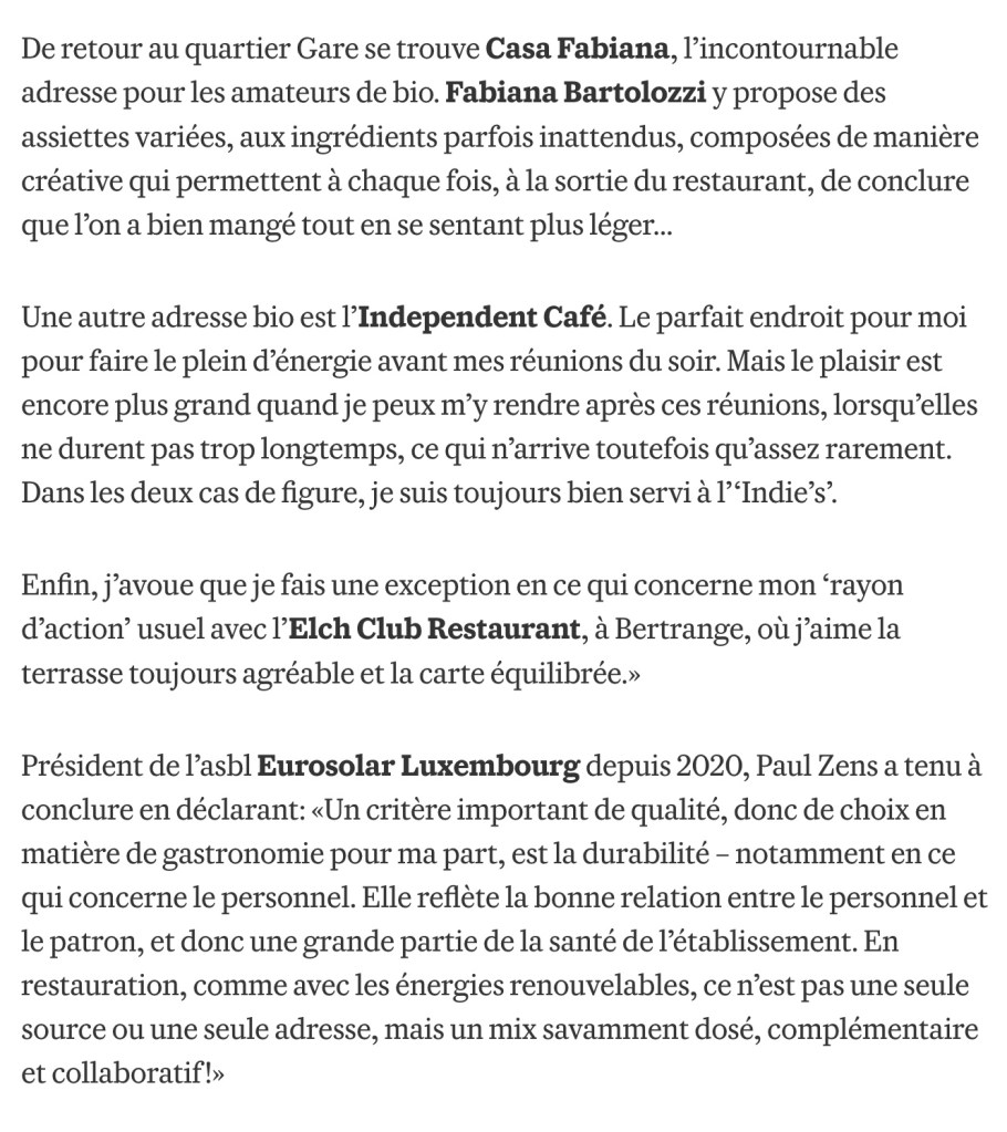 « Ma ech fannen dass wann eng Famill Suen z‘investéieren huet, ass et definitiv eng schlau Art a Weis seng Suen z‘investéieren. Well et mécht een eppes fir d’Nohaltegkeet, et ass och ekonomesch fir eis, an et ass och finanziell halt een Avantage fir eis, well mir eisen eegene Stroum kënne produzéieren, an dee weider verkafen. An zumools, mir maachen eppes fir d’Nohaltegkeet, ouni eis Habituden ze änneren. Well immens vill Leit fällt et schwéier hier Habituden ze änneren am Alldag. Ech fannen, et ass awer schonn immens gutt esou ».