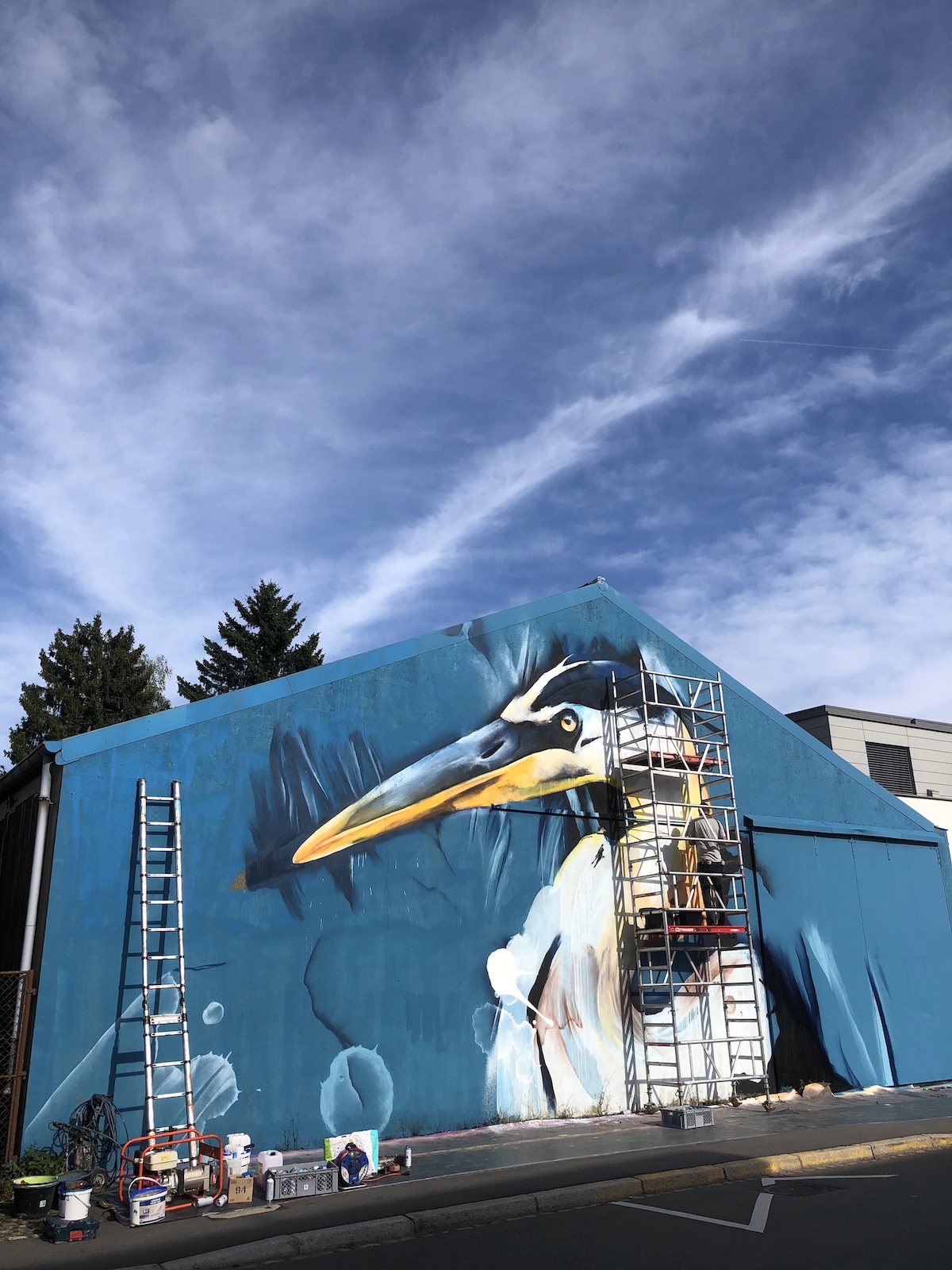 Dat gesot, ech hunn Haut gesinn, also Haut hunn zwee Graffitti Künstler, de Raphaël Gindt an den Daniel Mc Lloyd, um ale Kierchbierg, um Busarrêt Paul Noesen, ee Graffiti gemoolt an zwar ee grouse Fëschreiher, op eng Wand vun engem Haus, een aalt Bauerenhaus, dat geschwënn ofgerappt gëtt.