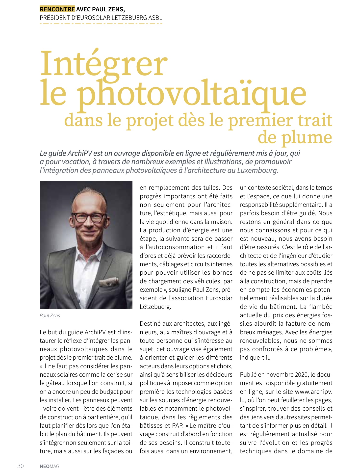 Le but du guide ArchiPV est d’instaurer le réflexe d’intégrer les panneaux photovoltaïques dans le projet dès le premier trait de plume. « Il ne faut pas considérer les panneaux solaires comme la cerise sur le gâteau lorsque l’on construit, si on a encore un peu de budget pour les installer. Les panneaux peuvent voire doivent être des éléments de construction à part entière, qu’il faut planifier dès lors que l’on établit le plan du bâtiment. Ils peuvent s’intégrer non seulement sur la toiture, mais aussi sur les façades ou en remplacement des tuiles. Des progrès importants ont été faits non seulement pour l’architecture, l’esthétique, mais aussi pour la vie quotidienne dans la maison. La production d’énergie est une étape, la suivante sera de passer à l’autoconsommation et il faut d’ores et déjà prévoir les raccordements, câblages et circuits internes pour pouvoir utiliser les bornes de chargement des véhicules, par exemple », souligne Paul Zens, président de l’association Eurosolar Lëtzebuerg.
