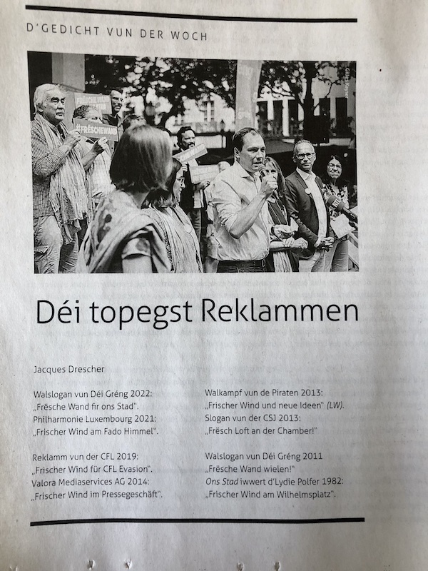 Wat den Owend ubelaangt: vill Leit, net nëmmen déi Stater gréng, stelle sech d’Fro op d’Kulturpolitik vun an an der Stad Lëtzebuerg, den Usprëch vun enger zäitgeméisser Kulturpolitik an och enger Kulturentwéckelungsstrategie gerecht gëtt.