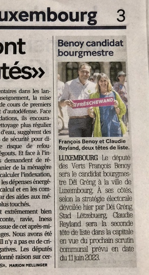 Zesummen mam Linda Gaasch, Co-Presidentin vun de Stater gréng, hat ech als Co-President, d’Freed fir de Spëtzenduo fir d’Gemengewalen vum 11. Juni 2023 virzestellen.