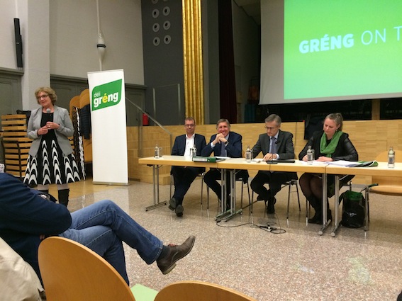 Fir z’explizéieren a Froen ze beäntwerten ginn déi gréng am Moment op de Tour. En Dënsdeg, 13. Abrëll, ware si an der Stad am Casino syndical zu Bouneweg. Si waren bal all do. De Felix an de Fränz haten déiselwecht Cravatte un. De Gérard wéi gewinnt ee peppegt Hiem, de Claude war ee man in black, iwwerdeems de Roberto dynamesch locker, flockeg um Stull soutz a gelauschtert huet wat d’Viviane a sénger Introductioun an dono déi gréng Regierungsmember, dem bal ganz ordentlech gefëlltene Sall an der interesséierter Audience, wéi ëmmer kompetent, anschaulech a rhethoresch geschlaff, gesot hun.