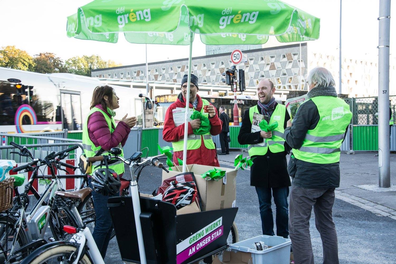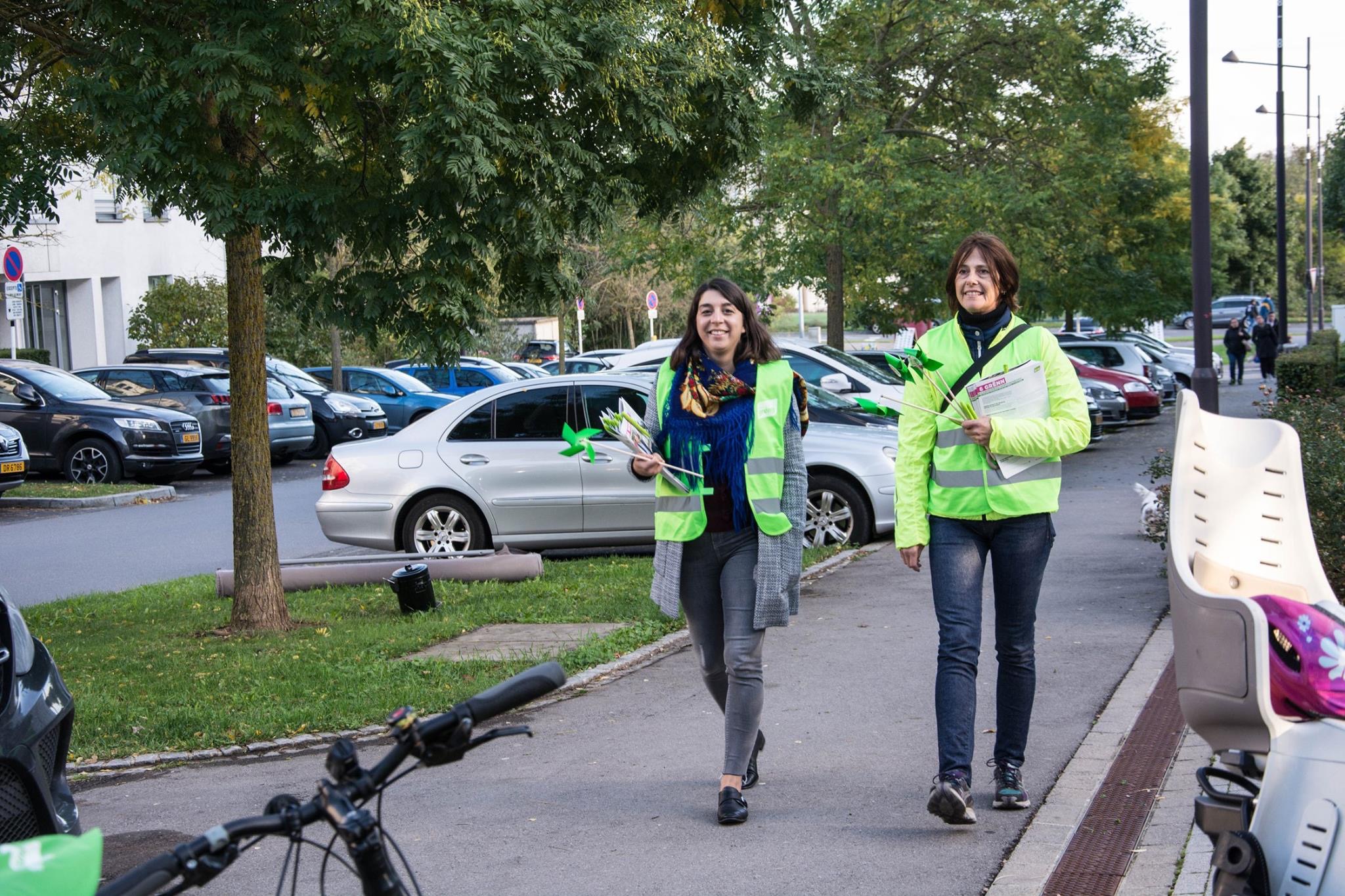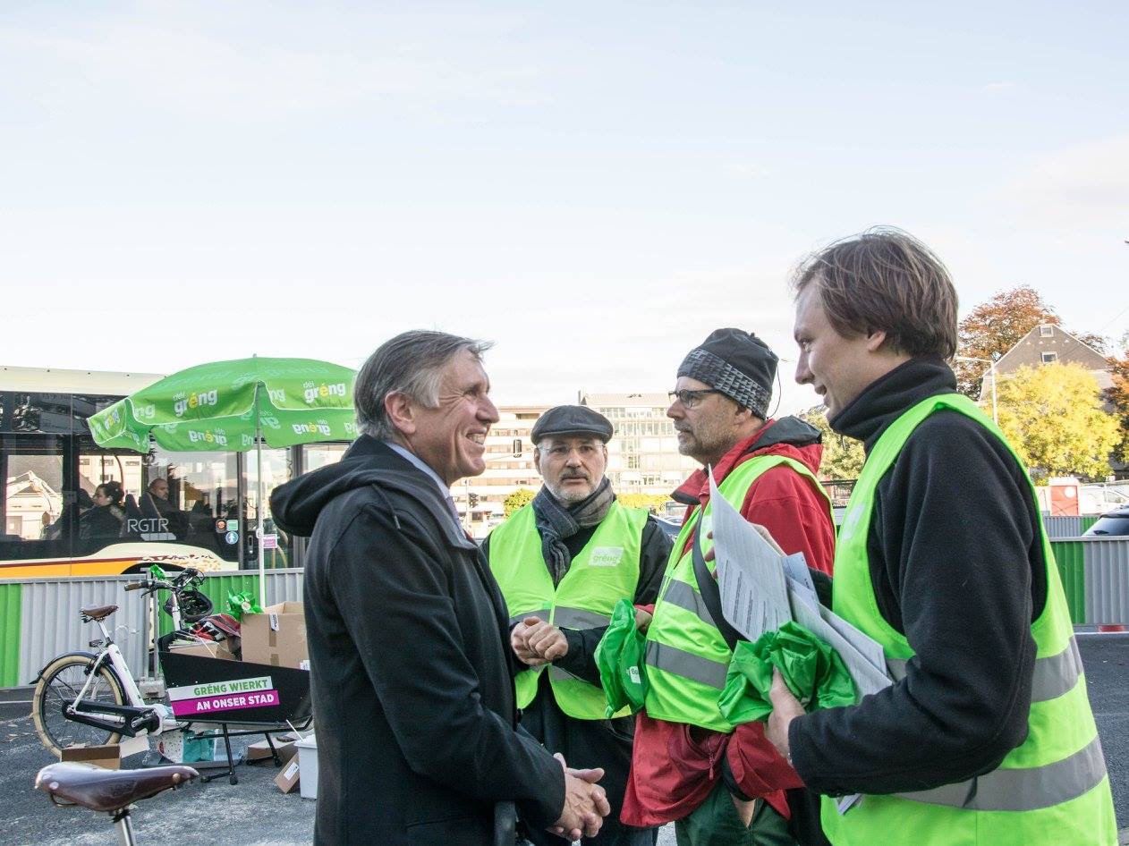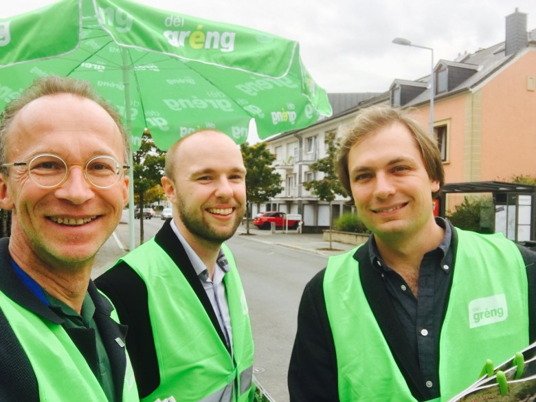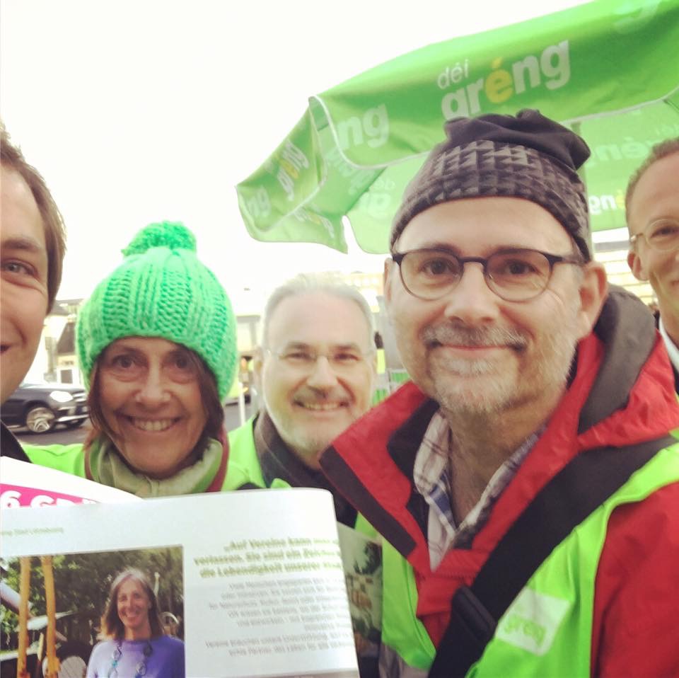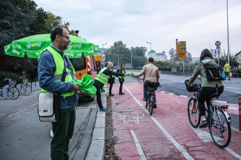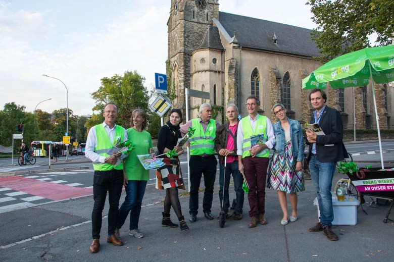 Haut de Moien hu mir um Rond Point Schuman gewahlkämpft. Ons Bikker, Déplianten, Velosuedelüberzieher si fortgaange wéi waarm Bréidercher. D’Schüler ware frou well ons gréng Bikker schreiwen keng inhaltlech programmatesch Feeler, sou wäit ech dat iwwerbléken.