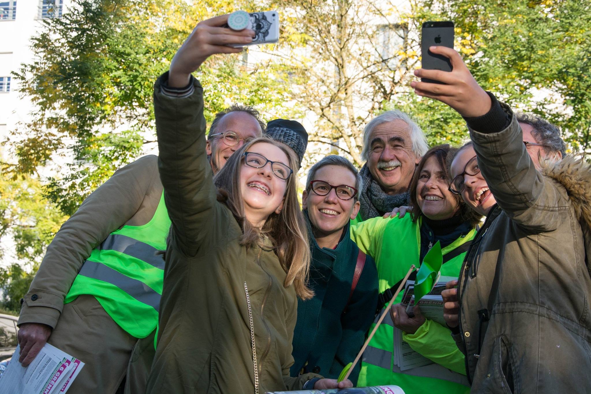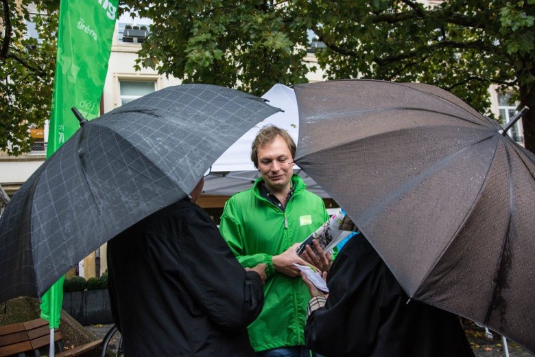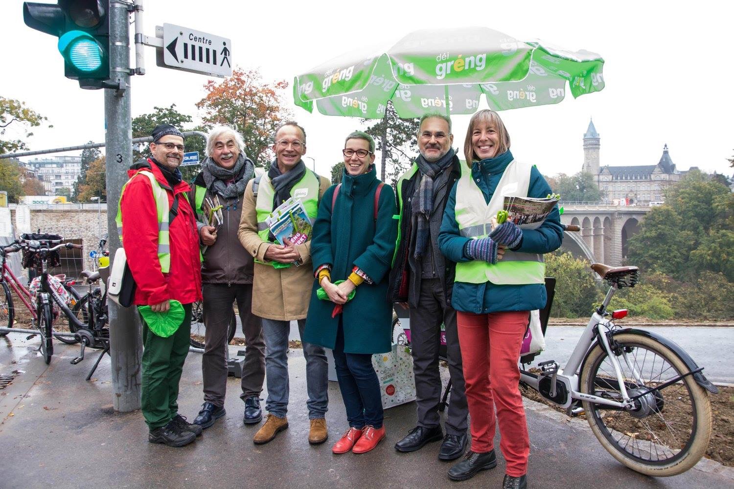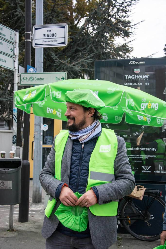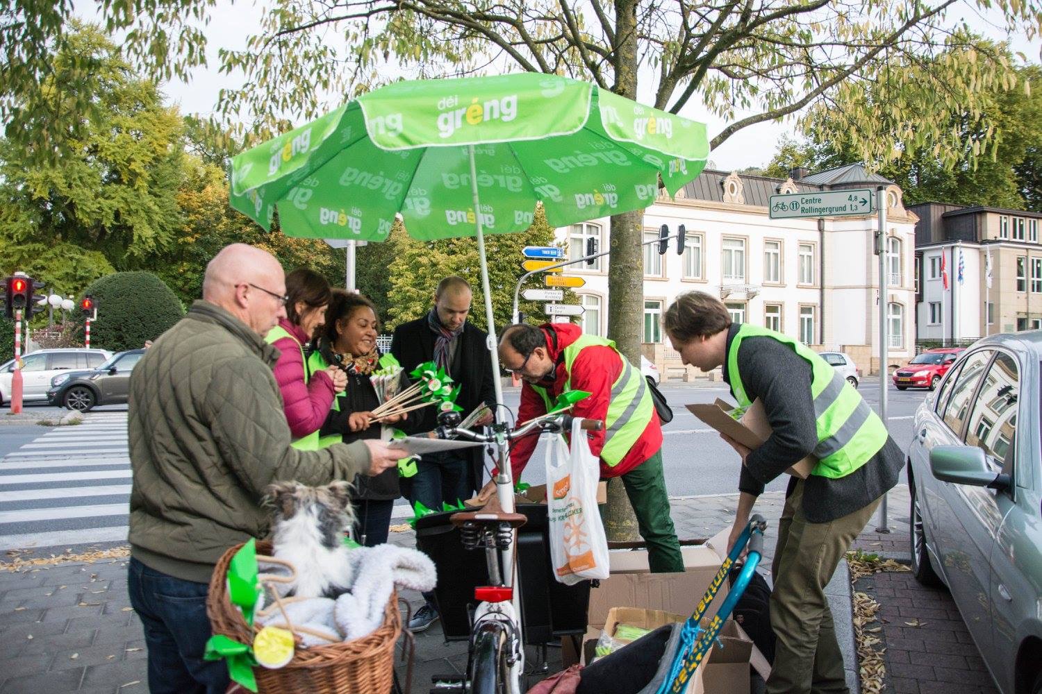 Haut de Moien hu mir um Rond Point Schuman gewahlkämpft. Ons Bikker, Déplianten, Velosuedelüberzieher si fortgaange wéi waarm Bréidercher. D’Schüler ware frou well ons gréng Bikker schreiwen keng inhaltlech programmatesch Feeler, sou wäit ech dat iwwerbléken.